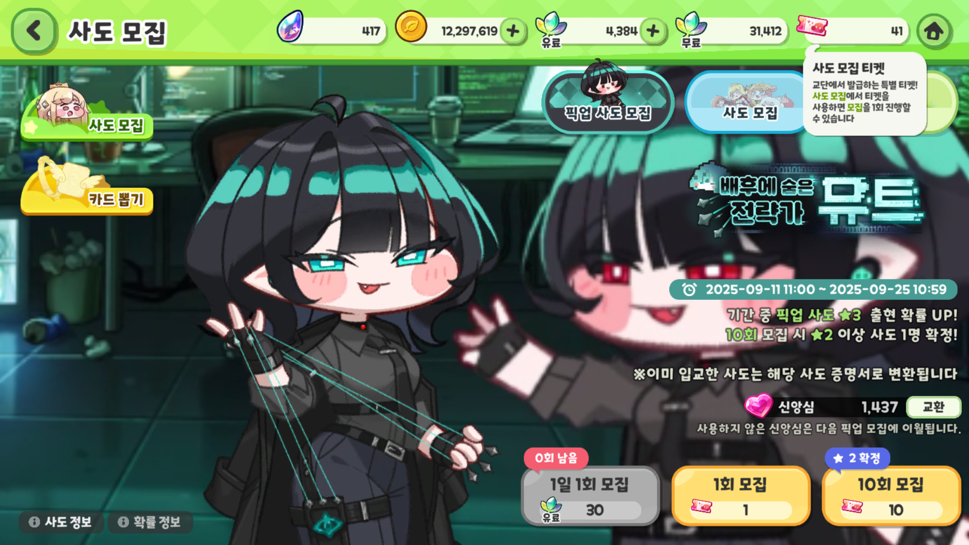 중요한 것은 엘다인을 제외한 신캐는 뽑지 않거나 뽑기를 최소한으로 하는 것이다. 만약 위와 같이 테마극장의 특별 업적에 모집 50회 보상으로 황크가 존재하는 경우에만 친구에게 받아서 모아둔 리프 포인트를 최대한 활용하여 소셜 모집을 통해 뽑기 횟수를 채우고 남은 횟수를 픽업 사도 뽑기로 채우는 선에서만 뽑기를 진행한다. 그 이유는 아래와 같다.