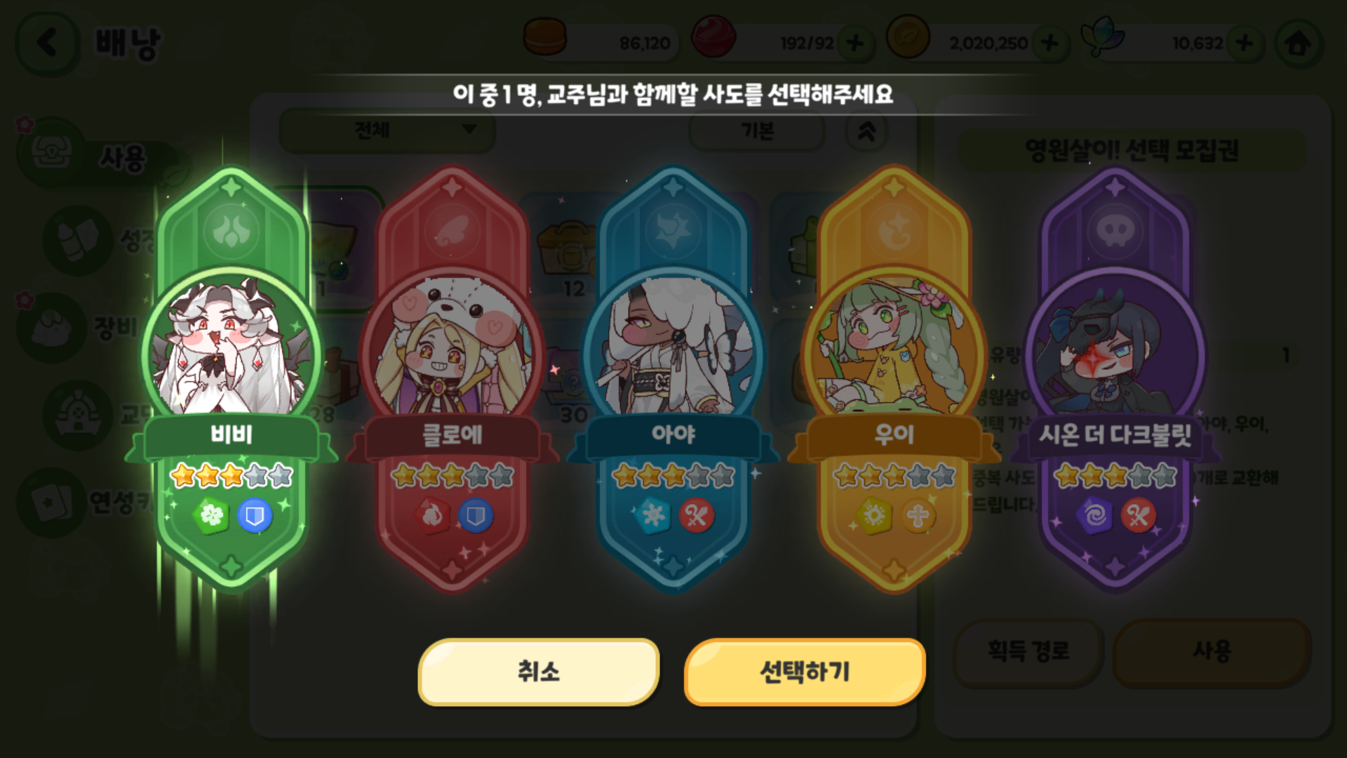 만약 비비, 우이를 이미 보유 중인 경우에는 모집권을 킵해두고 이 중 4명의 명함을 획득하고 남은 한 캐릭터의 명함을 획득하는 방식으로 모집권을 사용하는 것이 가장 이상적인 방법이다.